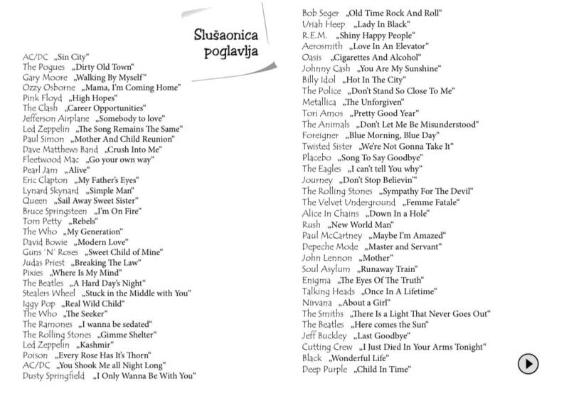 Roman “Rock strana bajke” sastoji se od poglavlja koja su nazvana prema pjesmama rock žanra različitih izvođača. Sadržaj poglavlja zapravo je playlista od otprilike 60 pjesama koja pomaže pri shvaćanju radnje određenih poglavlja i dijelova poglavlja.